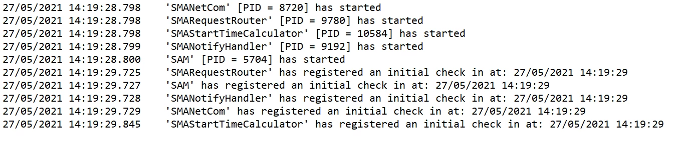 Processes are started (SMANetCom, SMAStartTimeCalculator, etc.) with success and are running.