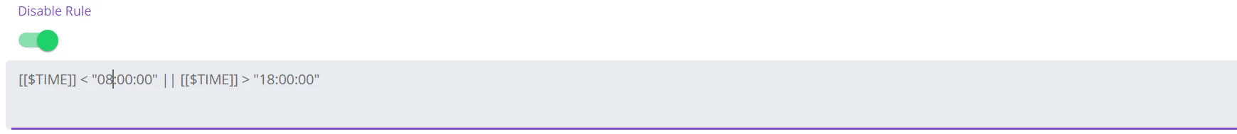 The rule : [[$TIME]] < "08:00:00" || [[$TIME]] > "18:00:00" means that the button will be disabled between 6 PM and 8 AM. Please note the double pipe || which means OR.