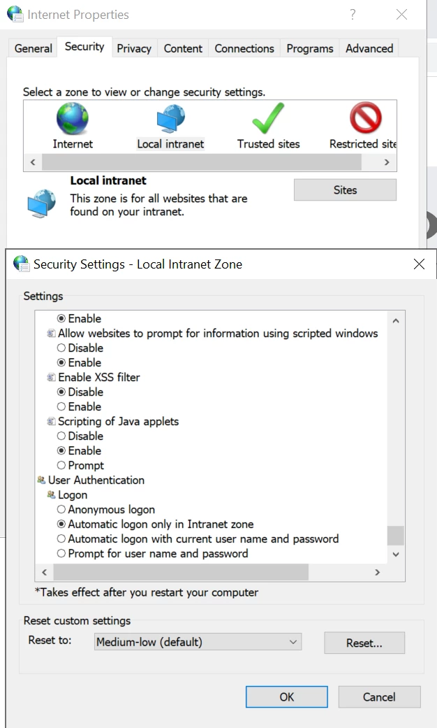 In the search bar, enter Internet Options, then go to the Security tab, select Local Intranet, Custom Level: