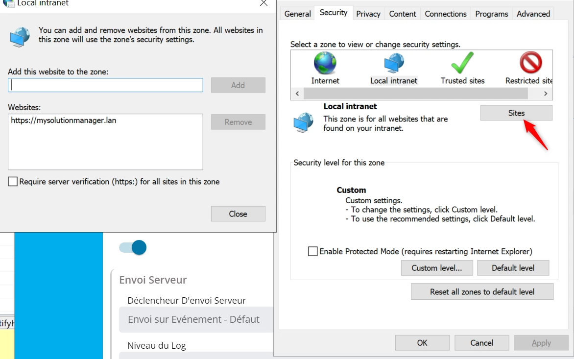 Then add the solution manager URL to the local Intranet site to allow this URL to use the allowed Security for this Zone (see below):